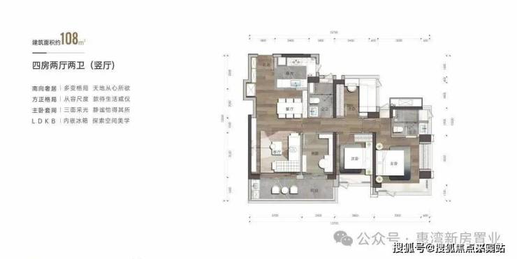建筑面积约108㎡户型-4房2卫(竖厅)