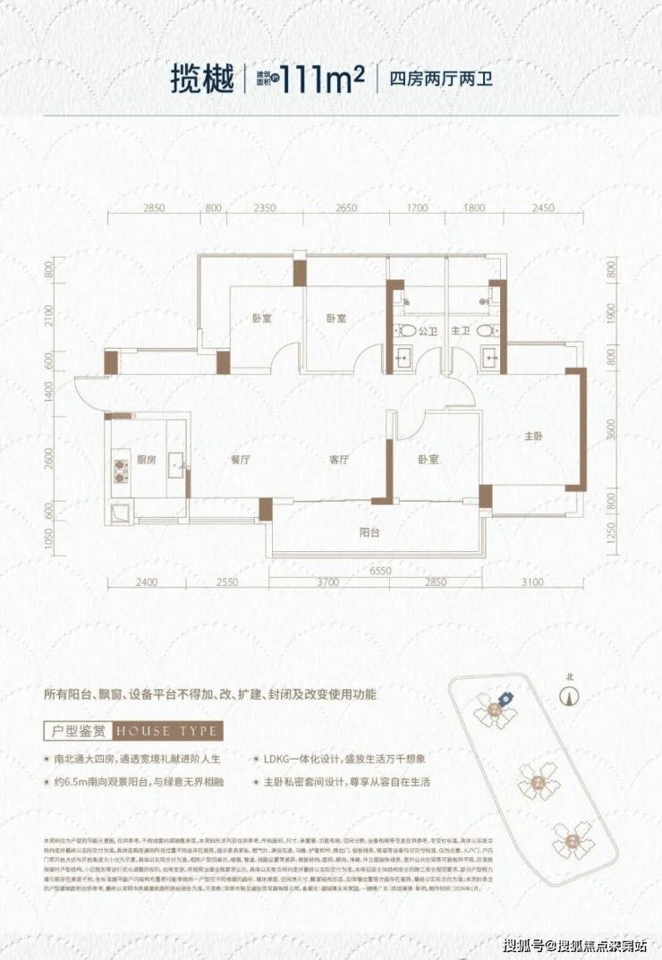 111㎡的4房2厅2卫,设计的是横厅南北通透格局,独门独户,进门入户玄关,客餐厅6.25米开间,LDKB一体化,全屋10面飘窗,主卧南北通,分别做到了主卧16.6㎡/次卧10.54㎡/次卧9.27㎡/次卧7.41㎡(包含墙体飘窗),U型厨房,卫生间干湿分离,得房率约102%(包含赠送),客厅连接次卧出6.55米长的大阳台,约10.8㎡主朝东南向。