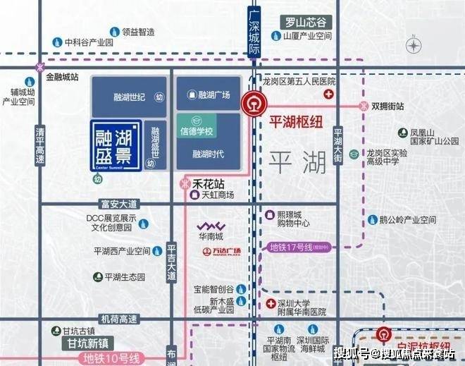 4地铁:项目距离10号线禾花站约500米(百度测距),连接坂田,直达福田中心区;另有规划中地铁17号线(直连罗湖口岸)/18号线(连通空港新城)/21号线(向西联系南山高新区、前海自贸区等高新区),通勤更高效;