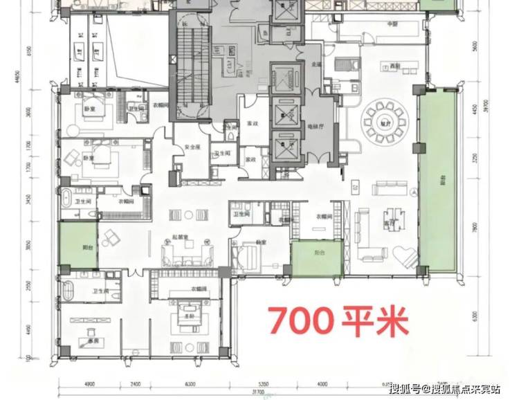 700平客厅约13.5米进深、开间约11米。阳台开间约15.5米,5房(4套房)
