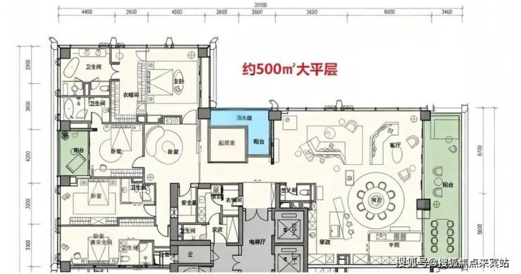 约500㎡户型入口结合入户阳台为对景,东侧配置超大尺度餐客厅,西侧以家庭厅为核心,配置了四卧全套房。