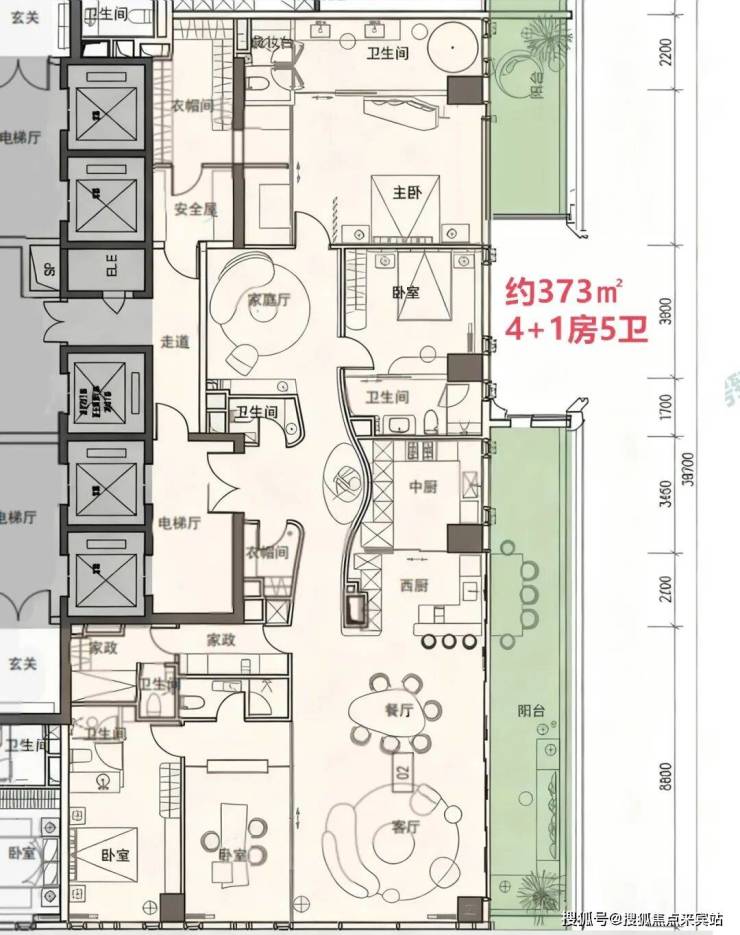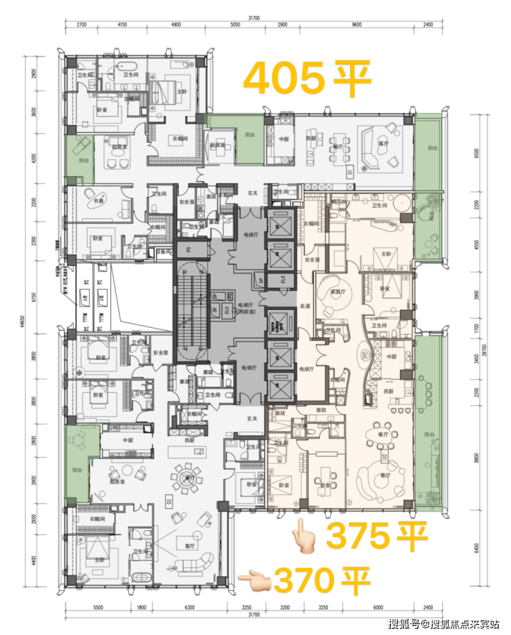——高区 40F起(150-200米)是约370-375-403㎡4+1房五卫+家庭厅+家政套间;