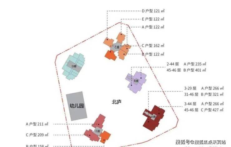1栋E座:141.7米,44层 共123户,朝南为主,三梯三户,158-209-211平