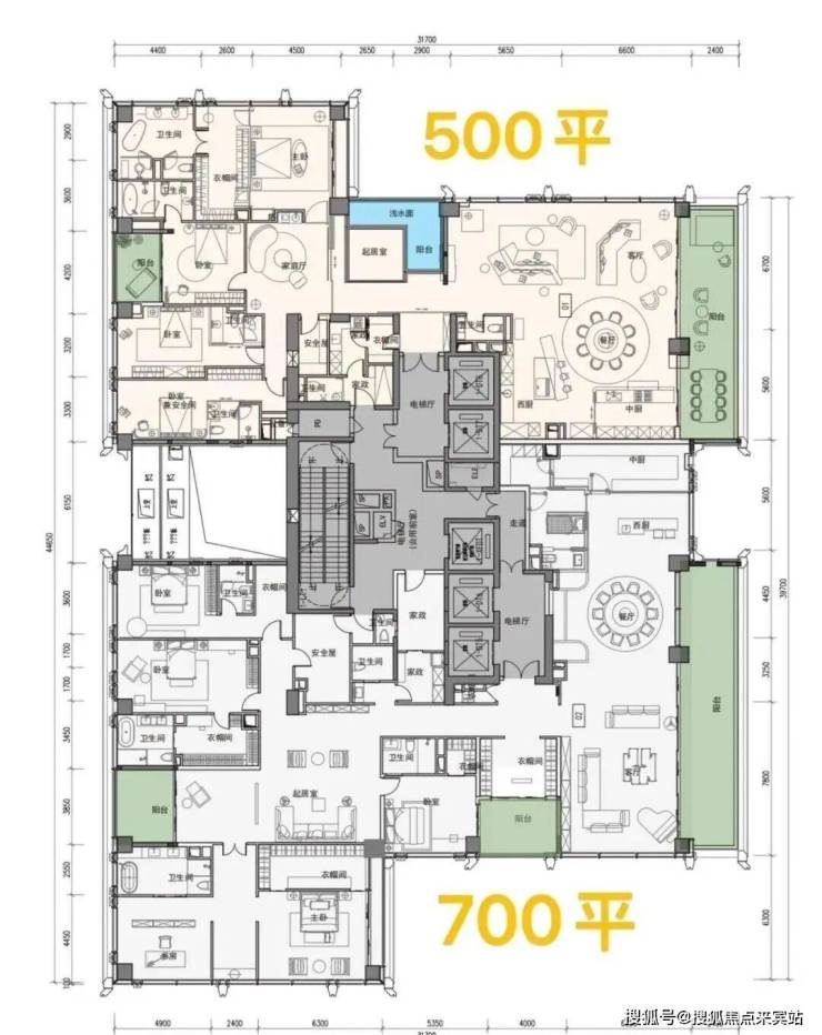 ②高区42F起(150-200米)是约370-375-403㎡4+1房五卫+家庭厅+家政套间;