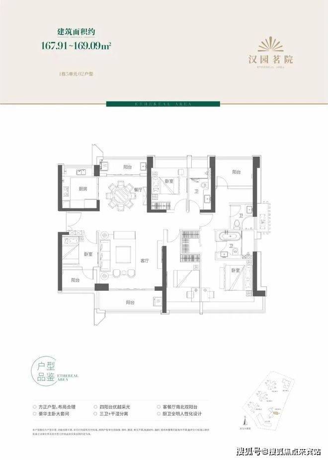 该户型主卧非常阔绰,可以算得上是02户型加强版。面积段同样在167-169平米左右3房2厅3卫,其中2个卧室都自带卫生间,对于家庭成员年龄段跨度较大的家庭十分便利。该户型同时带有4个阳台,采光条件良好,通风条件较佳。