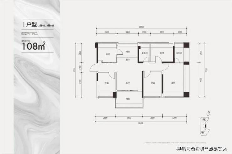 建面约108㎡通透四房户型