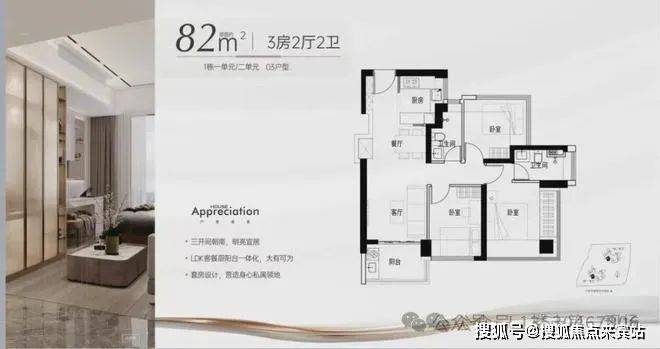 -82㎡的3房2厅2卫:03户型,设计的是竖厅格局,进门独立玄关,LDKB一体化,S墙设计预留冰箱卡槽位,主卧双飘窗设计,L型厨房,卫生间干湿分离,得房率约97%(包含赠送),西南朝向。