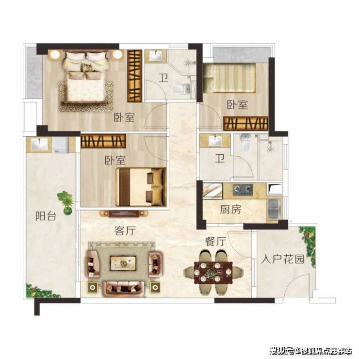 建面约106m² 3房2厅2卫,户型方正实用,动静分区,布局科学,主卧带转角飘窗,视野开阔无遮挡。