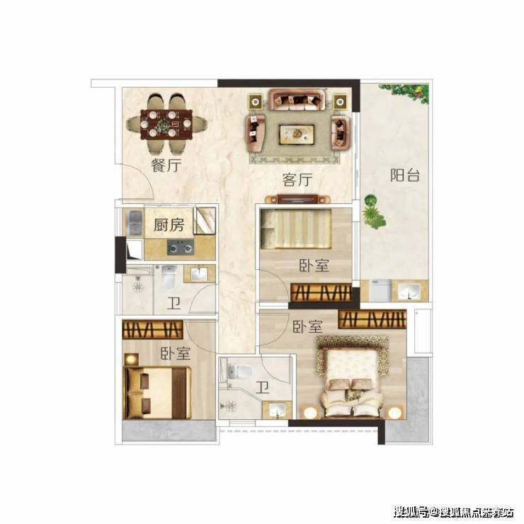 建面约92m² 3房2厅2卫,户型方正实用,动静分区,布局合理,主卧带转角飘窗,奢享270°视野。