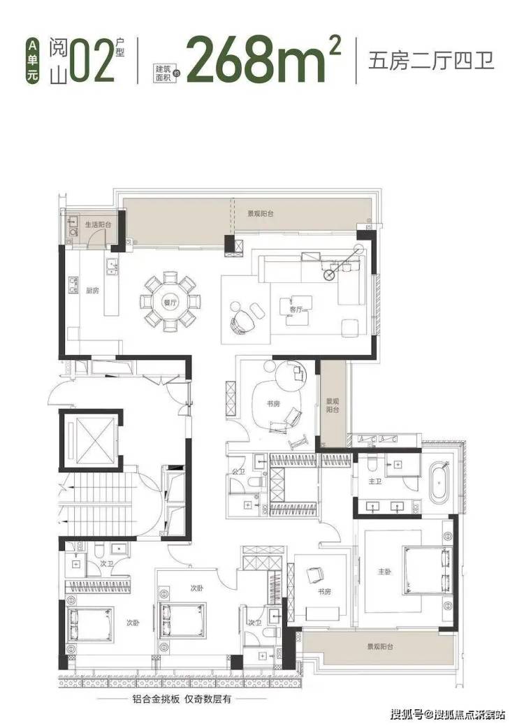 建面约268㎡五房四卫:楼王单位,总价2800-3000万。采用五房四卫三套间设计,南北四阳台、270°全景视野,约10.55米横厅,约16.1米南向大面宽。
