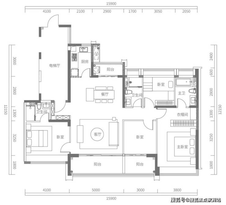 D户型建面约173㎡,4房2厅2卫