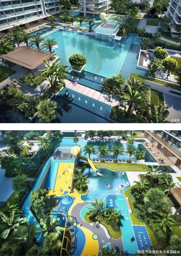 汲取曼谷四季酒店灵感,无边际泳池将奢华建筑与野奢景致自然相融,分区打造立体儿童泳池,特有的叠水景观、水上滑道、攀岩爬道等多元游乐设施,结合城市会客厅、亲水平台和水上汀步等多重景观,营造野奢型国际化度假体验。