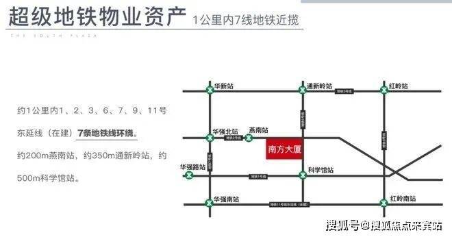 【纵横通达的立体交通】约1km内1、2、3、6、7、9、11号东延线(在建)7条地铁线环绕,距燕南站约200m,距通新岭站约350m,距科学馆站约500m,3站直达市民中心与会展中心;5km范围内,罗湖口岸、皇岗口岸、福田口岸等三大口岸集结;毗邻福田高铁站、罗湖高铁站,于此畅抵世界。