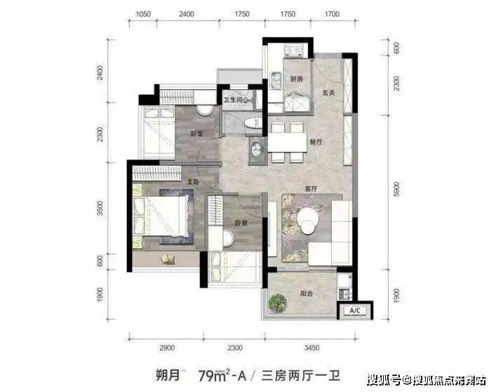 建面约79-118平的3-4房【朔月】79㎡竖厅,3房2厅1卫