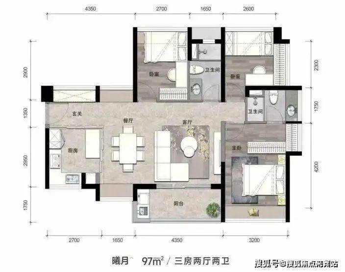 明星三房,格局朗阔,主卧套房,独立卫浴,入户玄关柜,客餐厅流畅分区,厨房中西岛台设计【曦月】97㎡,3房2厅2卫