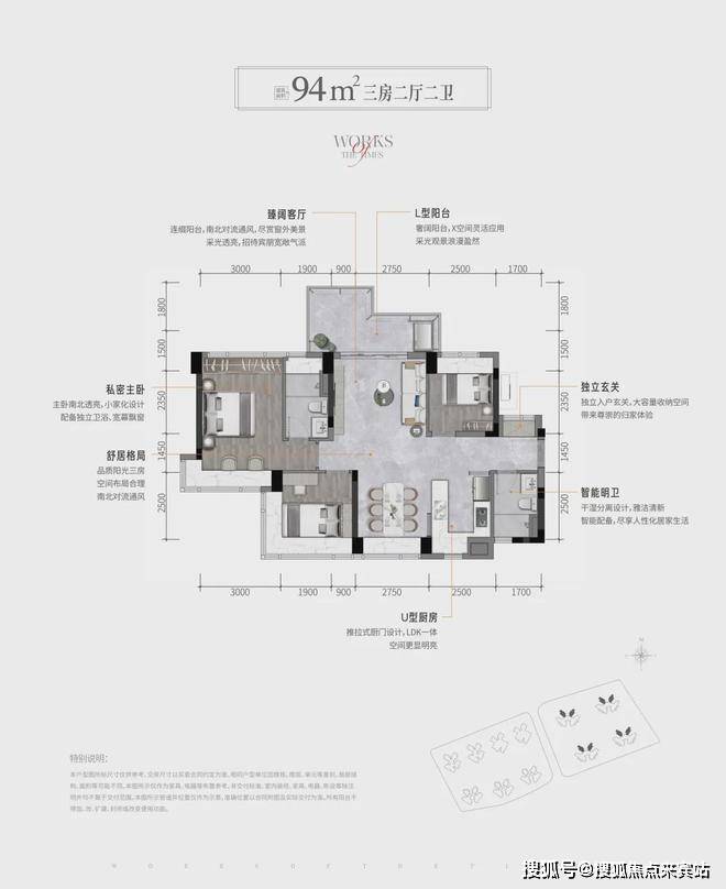 建面约94㎡的三房两厅两卫的产品共有两种户型。
