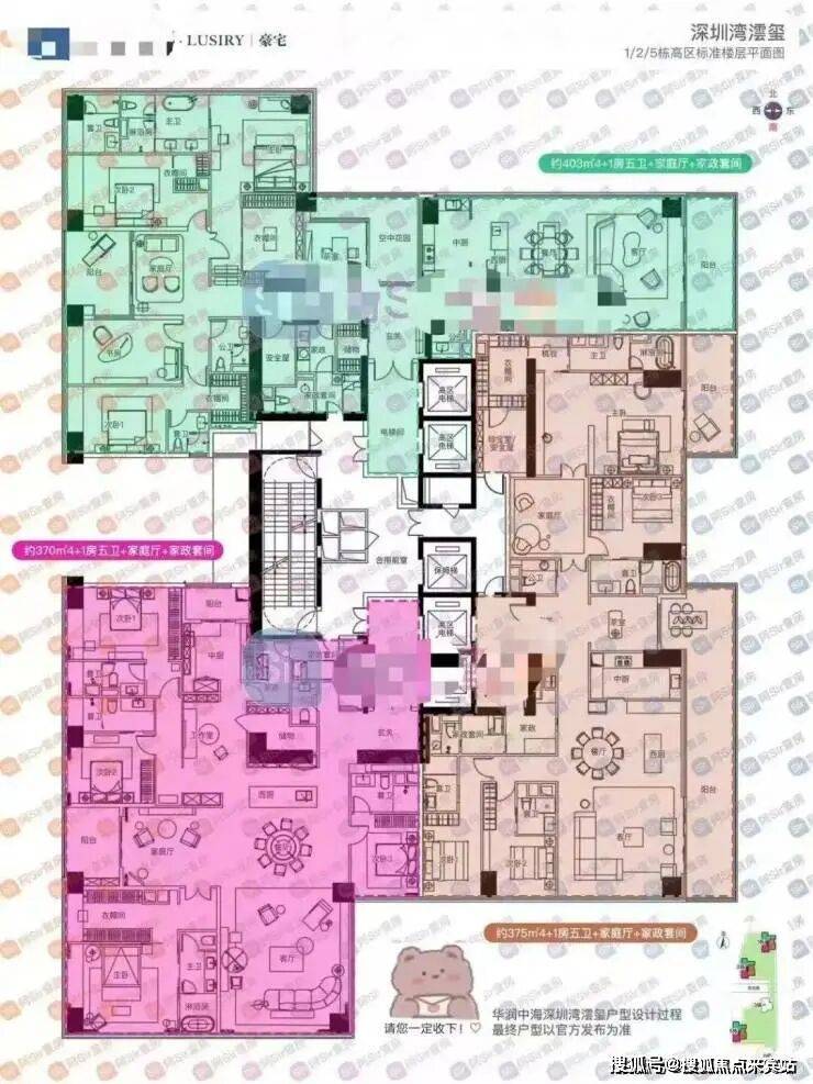 ②高区42F起(150-200米)是约370-375-403㎡4+1房五卫+家庭厅+家政套间;