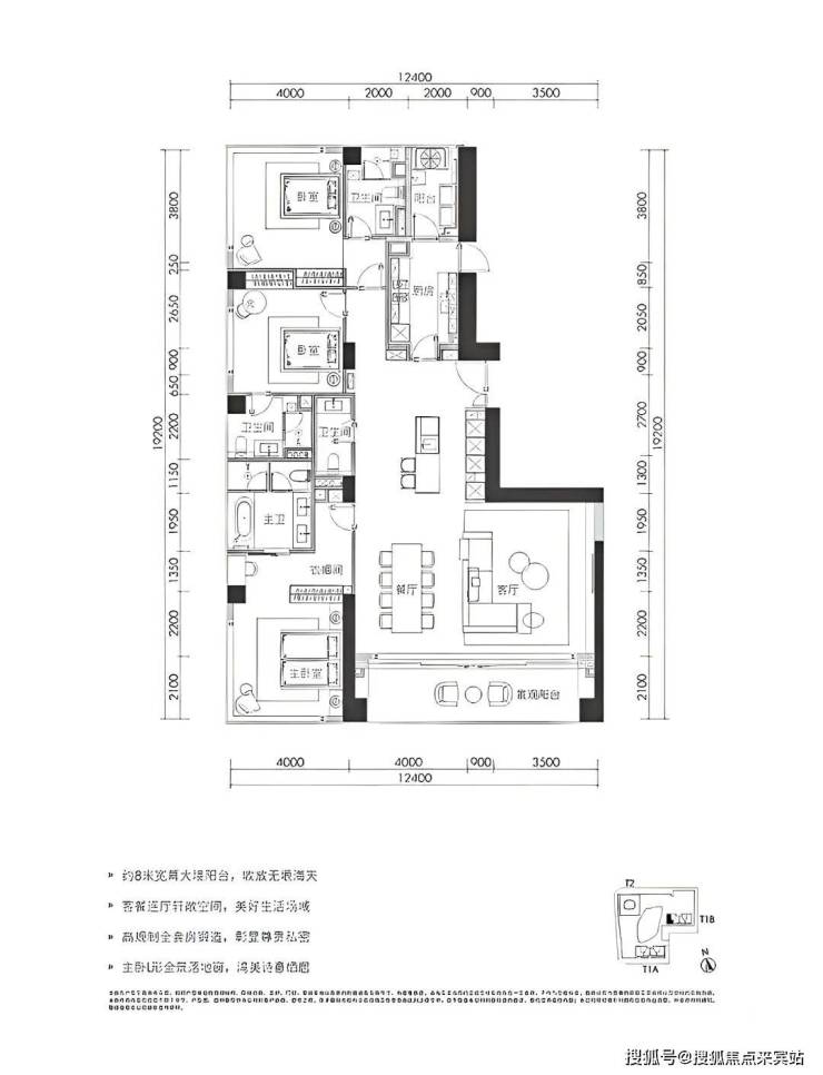 280㎡三房两厅四卫:位于1栋三、四单元24-32层,为05、08户型。拥有超8米超宽幕开间,厅出阳台可直面海景。采用三套房设计,主卧配备L形全景落地窗,占据270°最佳观海位。
