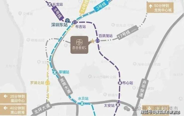 项目于5/17号线(建设中)百鸽笼站双地铁上盖,3/14号线环绕,1站瞬达罗湖,4站抵达福田芯