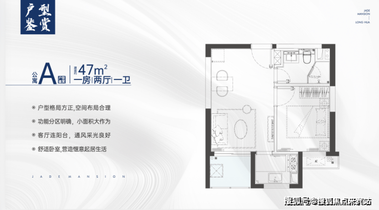 实现一房两厅一卫功能布局,独立明厨和干湿分离卫浴,客厅开间约3.5米
