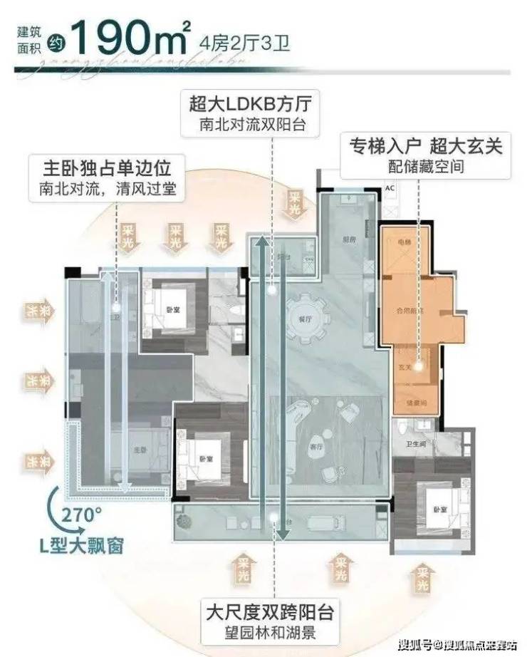 建面190平四房三卫,四开间朝南,9.4米观景阳台,客厅与次卧打通的话,客厅开间也可达9.4米,超43平的主卧,270度环幕飘窗越秀观樾售楼处电话:400-892-2273