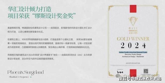 建筑大师:特邀深超总/前海豪宅同款设计团队华汇设计操刀,其作品从全球近3.8万件中脱颖而出,斩获有“设计界奥斯卡”之称的2024年国际奖项协会(IAA)缪斯设计奖金奖,该奖项仅约1%作品可获最高荣誉;