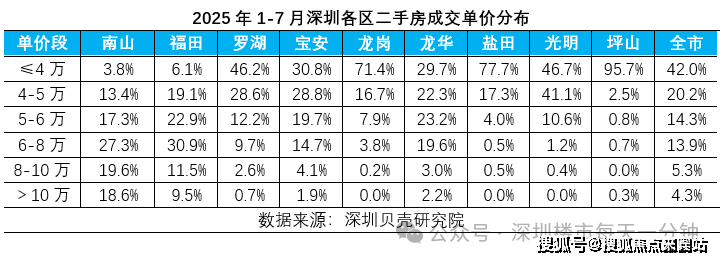 据深圳贝壳研究院数据显示,今年1-7月4万元以下成交占比达到42%,居各单价段之首。