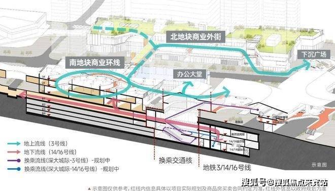 这里汇聚了3号线、14号线、16号线以及正在建设中的深大城际,形成了一个四线交汇的交通枢纽。