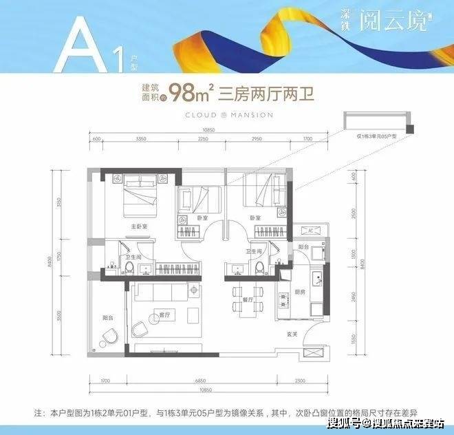 98㎡的3房2厅2卫(A1户型,1栋2单元01户型/1栋3单元05户型),设计的是竖厅格局,进门独立玄关,客厅3.5米开间,LDKB一体化设计,动静分区,3个卧室分别做到了3.15米/2.95米/2.25米的宽度,二字型厨房还带1个小生活阳台,得房率75-77%(不含赠送),阳台朝西向或东向。