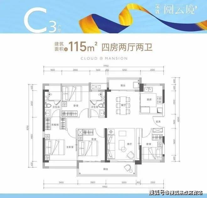 115㎡的4房2厅2卫(C3户型,仅1栋3单元01户型),设计的是竖厅南北通透格局,客厅3.45米开间,四开间朝南,双阳台设计,4个卧室分别做到了3.4米/2.8米/2.8米/2.3米的宽度,主卧大套房设计,客厅连接次卧出5.8米长的大阳台,U型厨房,得房率75-77%(不含赠送),大阳台主朝西南朝向。