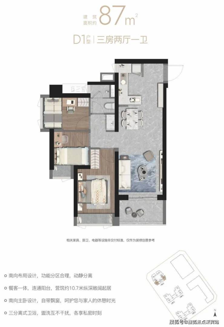 87㎡的3房2厅1卫,D1户型,5栋1单元01/04户型,设计的是竖厅格局,进门入户玄关,客厅3.3米开间,餐客厅一体化设计,约10.7米纵深,三开间朝南,动静分区,L型厨房,卫生间三段式干湿分离,得房率约80%(包含赠送),东南朝向。