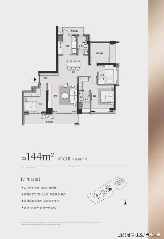建面约144㎡四房两厅两卫市中心稀缺南北双阳台对流户型,7.5m阔尺阳台,LDK客餐一体化,改善首选,东南向270°阳光入户,四季皆是明朗光景
