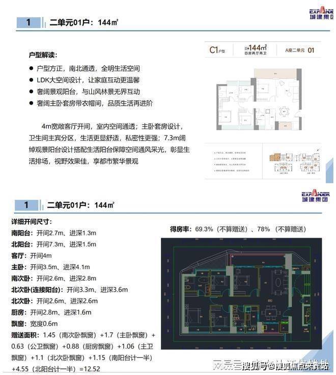 144㎡的4房2厅2卫:设计的LDK竖厅格局,动静分区,南北通透双阳台设计,客厅连接次卧巨幕阳台,L型厨房,客厅阳台主朝西北向。