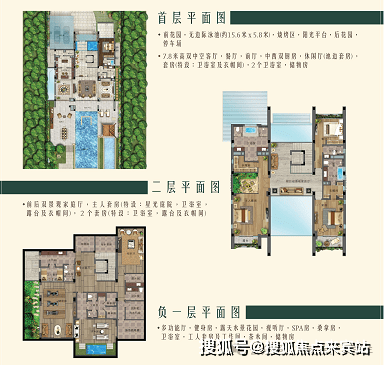 5室4厅7卫;地上二层,地下一层;单层净挑高4m;超大前入户停车花园,双车位;私家泳池花园层层叠加设计,活动平台、烧烤区、配60㎡独立泳池;前后花园设有独立入户门,业主可自由出入。步行1分钟即可到达沙滩海边。
