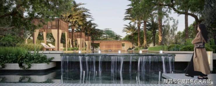 星级泳池 | 参考海滨岛屿度假风格,底部采用巴厘岛绿马赛克,甄选约9米高名贵树种银海枣