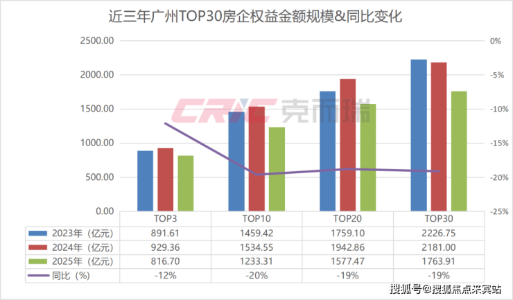 克而瑞数据监测显示,2025年广州权益金额TOP30房企业绩规模1763.91亿元,同比减少19%,TOP20梯队房企业绩规模1577.47亿元,同比减少19%;TOP10梯队房企业绩规模1233.31亿元,同比减少20%,TOP3梯队房企业绩规模816.7亿元,同比减少12%。