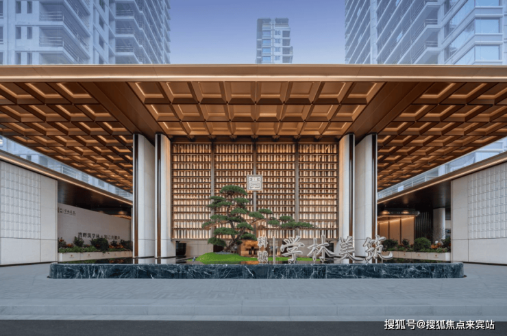 主入口门庭以学府高雅气质与庄重高墙规制面向城市,营造一方落客港湾,迎接高知菁英入境。臻选冠幅近5.5米的名贵迎客松,并以600余片定制青玉打造巨幕奢石景墙,呈现尊崇且轻松的惬意归家感。