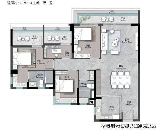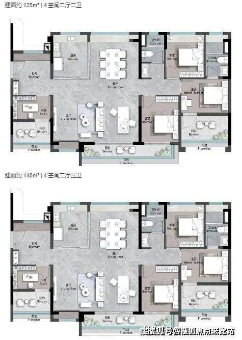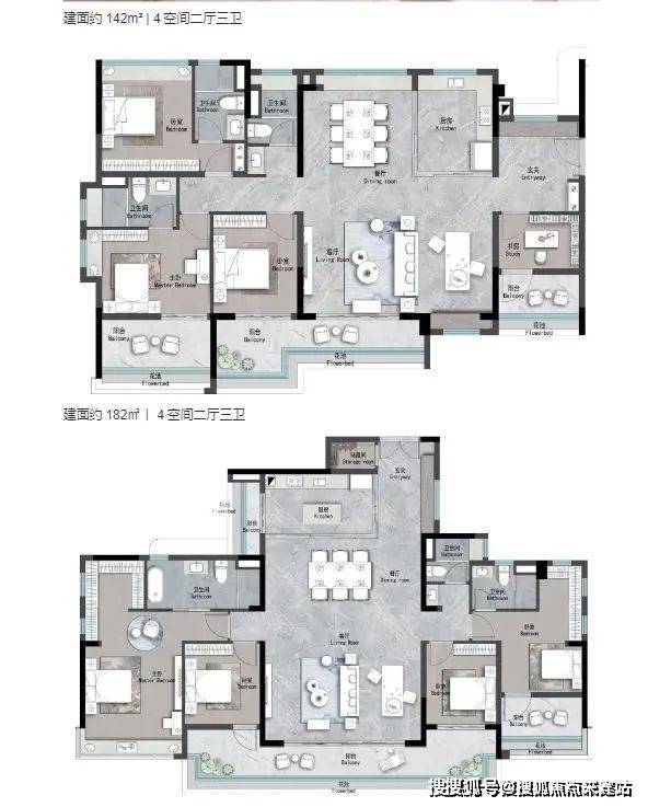 户型设计:98%户型朝南,140㎡四房采用“洄游动线”,主卧配备独立衣帽间+双台盆浴室
