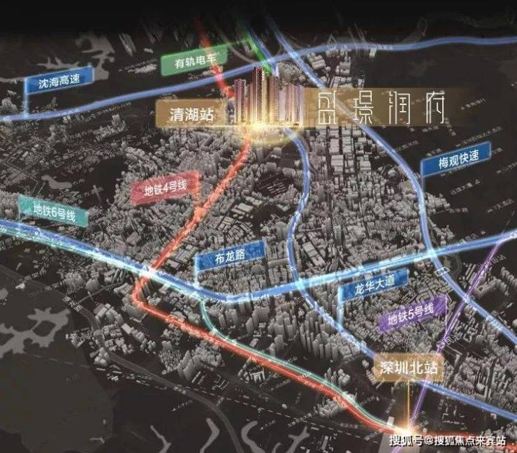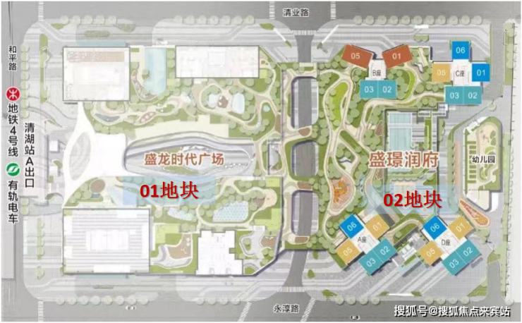 项目分为两个地块开发,02地块-盛璟润府可通过24h风雨连廊无缝连接清湖地铁站,而01地块以商业办公为主的盛龙时代广场就在地铁清湖站出口。