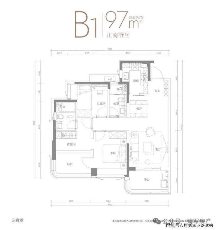 97㎡的3房2厅2卫,设计的竖厅格局,客厅3.5米开间,客餐厅一体化,三开间朝南,3个卧室分别是3.2米/3米/2.6米的宽度,U型厨房,得房率:76.55%(不含赠送),朝南向看花园。