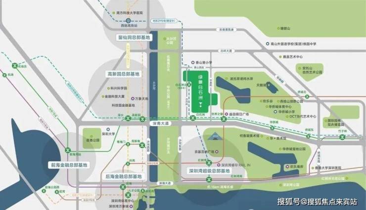 在伦敦、纽约这样的超级城市,其城市主轴的黄金分割点上均屹立着城市超级影响力的项目,如伦敦金丝雀码头、纽约中央公园,而深圳的发展主轴深南大道自东向西,绿景白石洲正处于黄金分割点之上。项目位处城市GDP第一的南山区,深南大道与大沙河科创走廊十字交汇点,代言深圳发展高度。