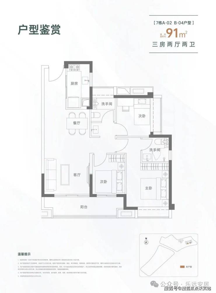 91㎡的3房2厅2卫,设计的是经典竖厅格局,进门入户玄关,LDKB一体化设计,三开间朝南,动静分区,客厅连接次卧出大阳台,L型厨房,公卫三段式分离,得房率约82%(不含赠送),东南朝向。