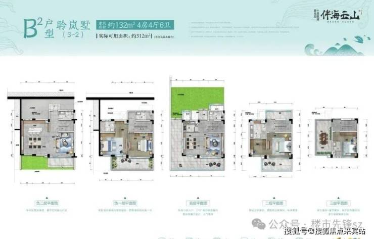 聆岚墅B2户型:建筑面积约132㎡,实际可用面积约312㎡(不计花园及露台)