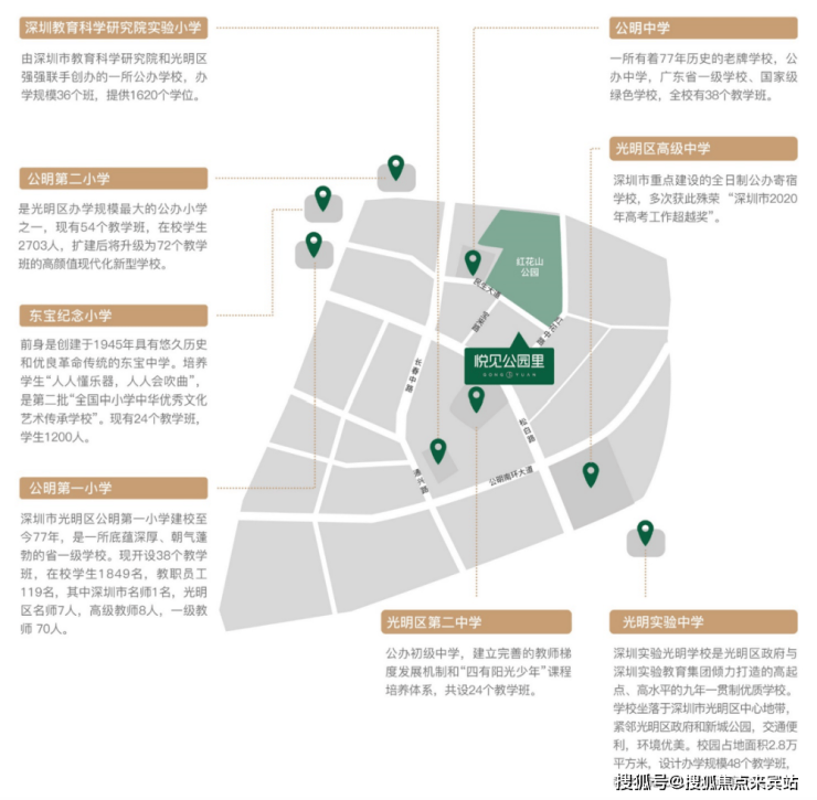 项目自带一所幼儿园,东南面紧靠一所18班小学(规划教育设施用地),周边小学有光明教科院实验小学、公明第一小学(省一级学校)、公明第二小学、东宝纪念小学等;一路之隔是光明区第二中学,还有深圳市公明中学(省一级公办中学)、光明区高级中学等。(实际学区学位以光明区教育政策为准)。