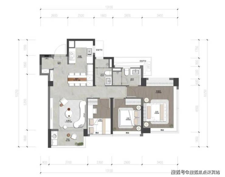 •可变空间:根据不同需求进行灵活调整:厨房打开形成中西厨+岛台空间;次卧打开,形成横厅X空间。
