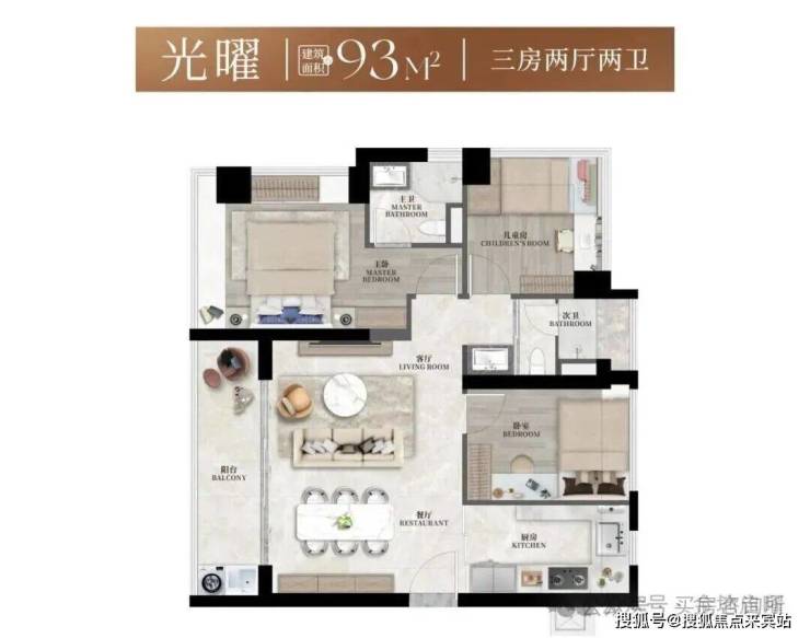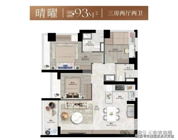 建面约93㎡3房2卫,设计了两种户型,在三房的功能尺度下实现大平层般的豪宅享受。