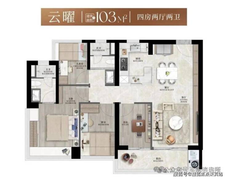建面约103㎡3+1房2卫,则提供了更丰富的实用可能性。