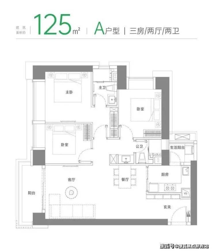 A户型 建面约125㎡三房两厅两卫