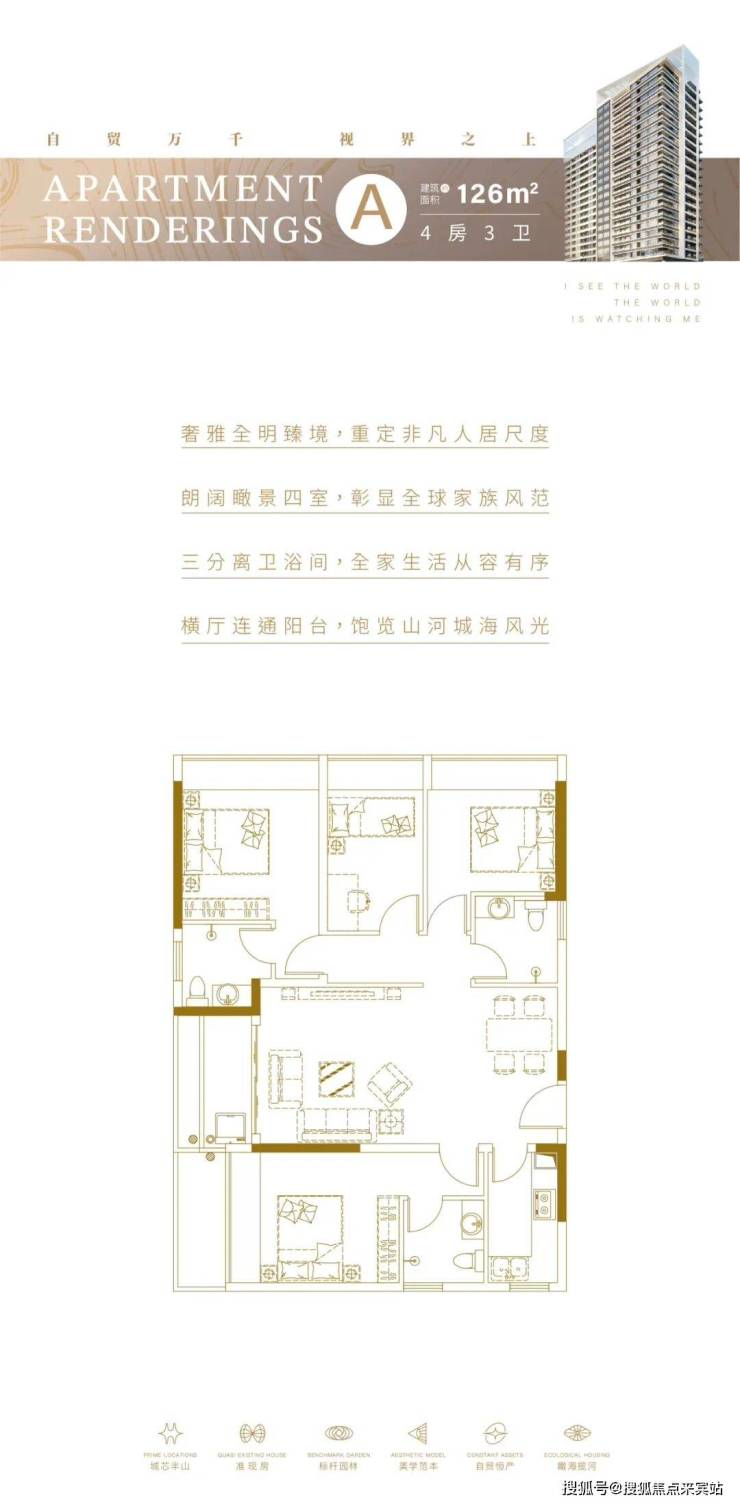 【高层信息指标】• 绿化率47%• 总户数:约2000户• 停车位:1000多个• 楼栋:共13栋(1#-15#)• 加推楼栋:1#(层高24楼)• 产权年限:70年• 交付时间:2025年6月🌟【在售户型鉴赏】🌟【A户型】建面约126㎡四室二厅三卫