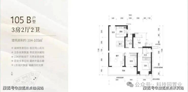 105㎡: 竖厅格局,客厅与卧室连通超大阳台,LDK一体化设计,主卧室270度转角飘窗,看城市景观,主要朝向为西南和东南